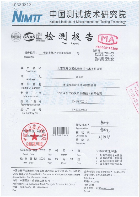 波恩儀器超聲波風(fēng)速風(fēng)向儀檢測(cè)報(bào)告