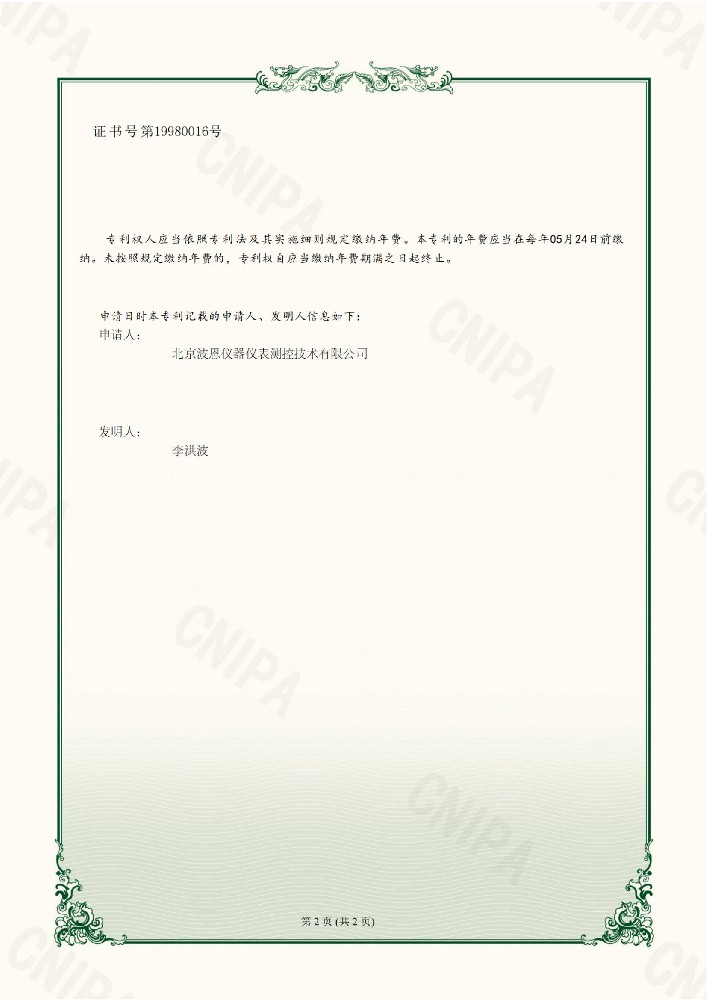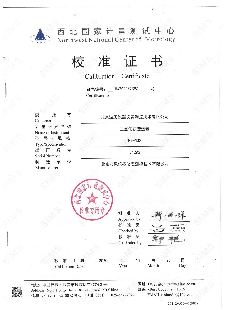 波恩儀器二氧化氮NO2變送器校準(zhǔn)證書